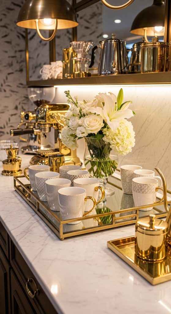For those who love a touch of luxury, a glamorous coffee and tea station can turn your daily ritual into an elegant experience. Think marble surfaces, metallic accents, and glassware that sparkles.