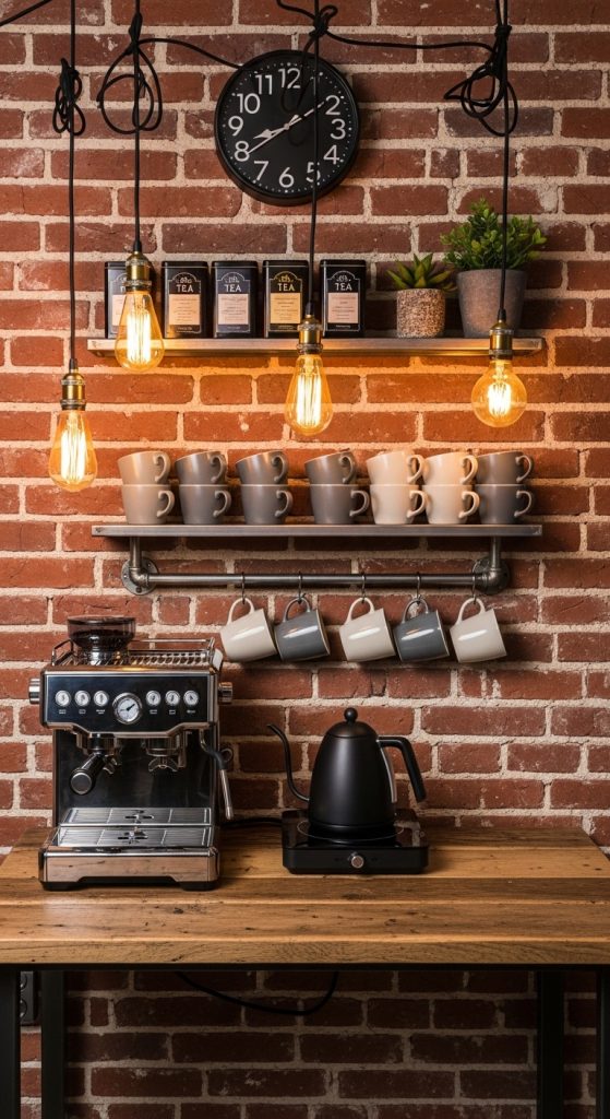 Industrial-style decor has become increasingly popular for both kitchens and living areas. To achieve this look for your coffee and tea station, use materials like metal, wood, and brick.