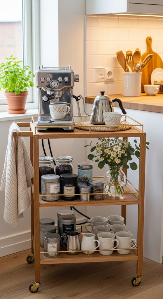 Choose a stylish bar cart with multiple tiers to organize everything. The top shelf can hold your coffee maker or kettle, while the bottom tiers store mugs, spoons, and supplies.