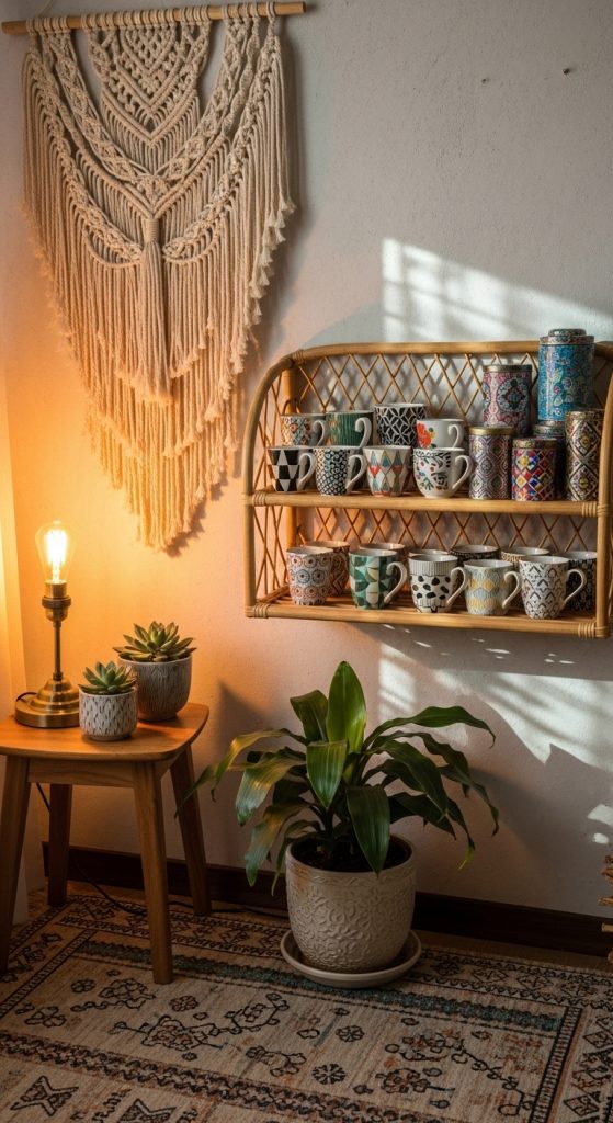 Set up a wooden or rattan shelf with colorful ceramic mugs, patterned tea tins, and vintage teapots. Add plants, macrame wall hangings, or woven placemats for texture and warmth. Mixing different patterns and tones adds depth and personality.