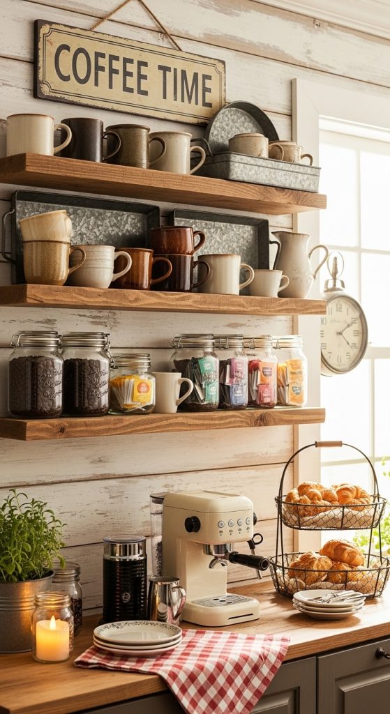 Install floating shelves made from reclaimed wood to display mugs, jars of sugar, and canisters filled with tea bags or coffee beans. Add some metal accents such as a galvanized tray or black iron brackets for a touch of industrial charm.