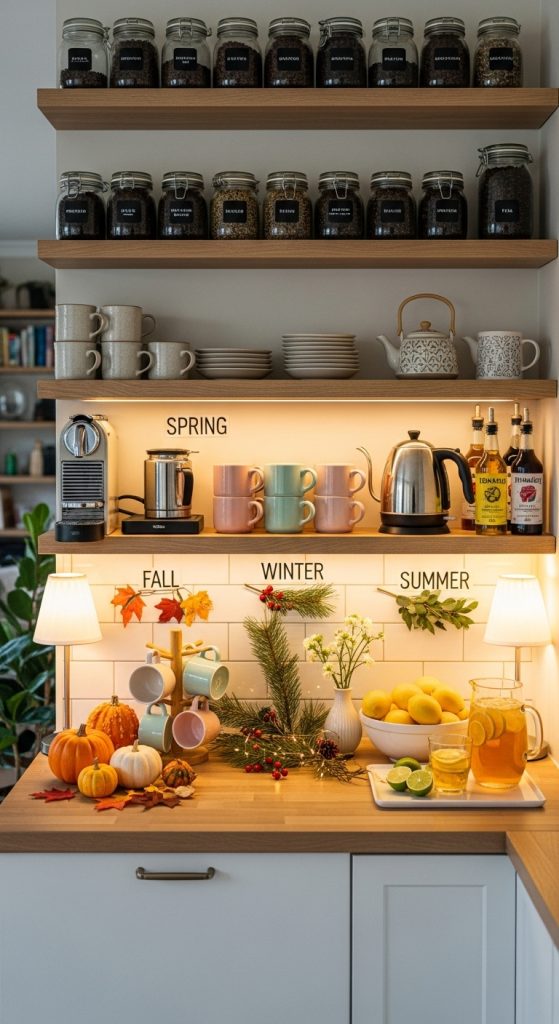 For those who love to decorate throughout the year, a seasonal coffee and tea station offers endless possibilities. You can update it according to holidays, weather, or special occasions.