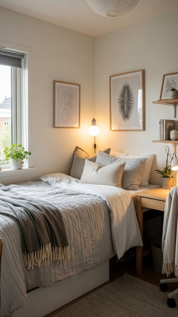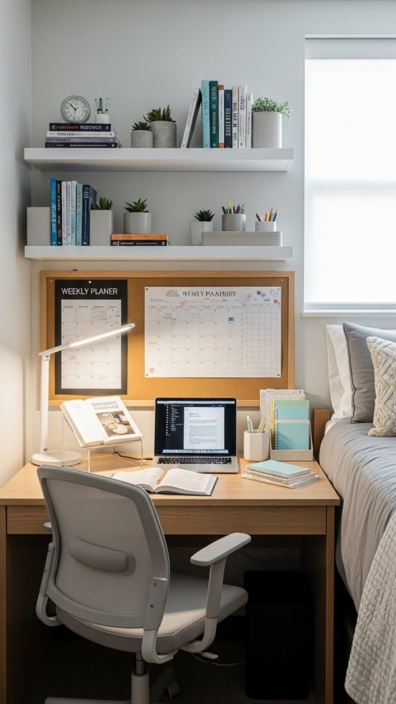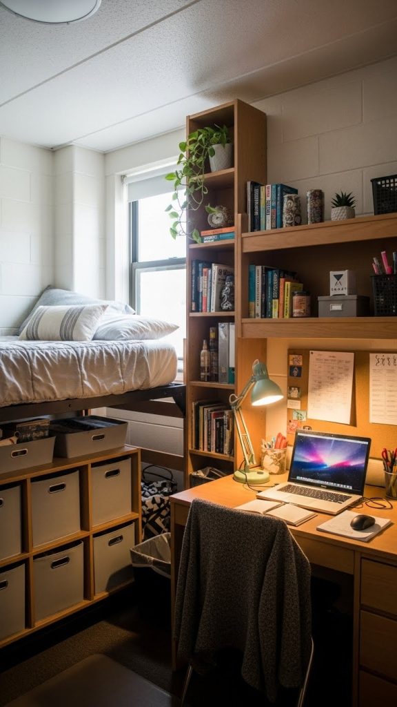 The bed area should remain cozy but uncluttered. Avoid too many distractions near the desk. A study focused dorm room supports academic success while still feeling welcoming.
