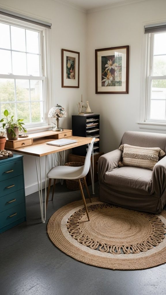 The desk area should be the centerpiece. Choose a comfortable chair and ensure proper lighting with a desk lamp that reduces eye strain. Keep supplies organized using drawer organizers, shelves, and desk trays.