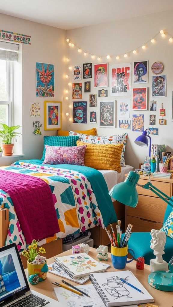 A colorful creative dorm room is perfect for students who love bold expression and artistic energy. This style embraces vibrant colors, playful decor, and unique design choices.