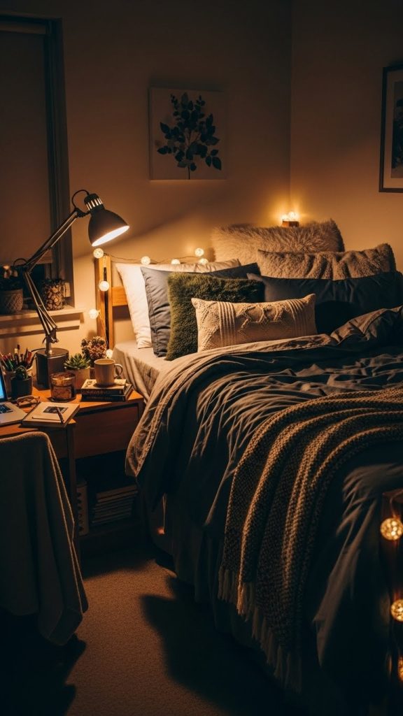 Decor should be minimal but comforting. Candles may not be allowed, but battery powered alternatives create a similar effect. A cozy nighttime dorm room feels like a safe retreat from campus life.