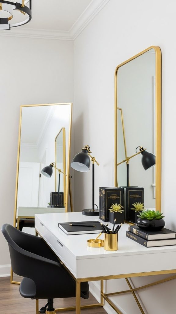Choose a neutral base with shades like white, black, gray, or taupe. Add metallic accents such as gold or silver through desk accessories, lamps, or picture frames. Bedding should be simple but high quality, with solid colors and minimal patterns.