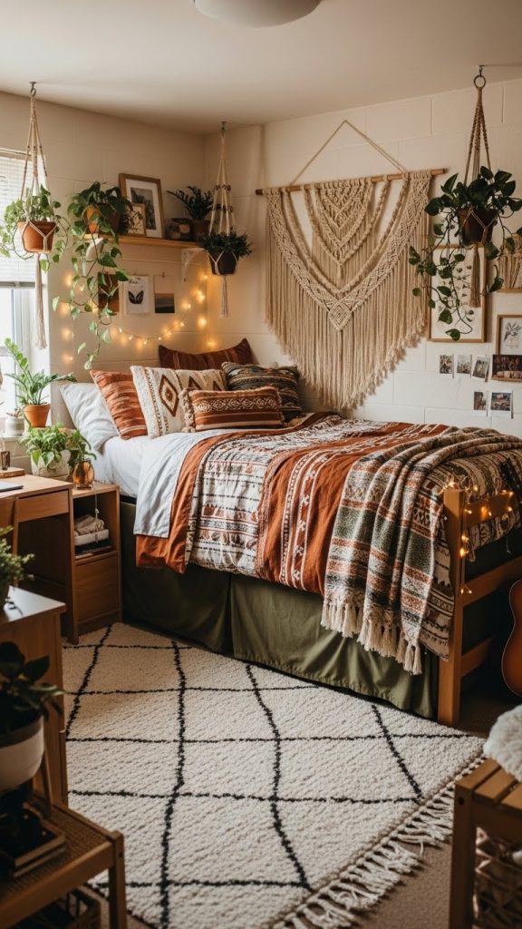 Wall decor can include tapestries, hanging plants, or framed art prints. Since dorm rules often limit nails, use removable hooks and adhesive strips. Plants, whether real or faux, are essential for a boho look and instantly bring life to the room.