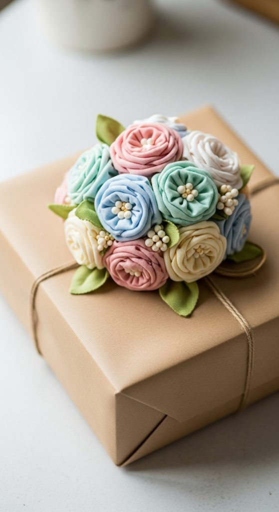Fabric flowers can elevate your gift wrapping to a whole new level. Attach small handmade flowers to gift boxes or gift bags to create beautiful keepsake wrapping. This idea is perfect for birthdays, weddings, baby showers, and holidays. The recipient can reuse the flowers in their own decor or craft projects.