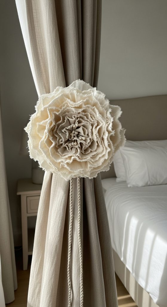Choose fabric colors that match or contrast with your curtain. Soft beige flowers on white curtains create a minimal look, while patterned flowers add a playful touch. If you prefer elegance, try ivory or champagne colored satin flowers. These tiebacks can be easily removed and swapped with different sets for seasonal decor.