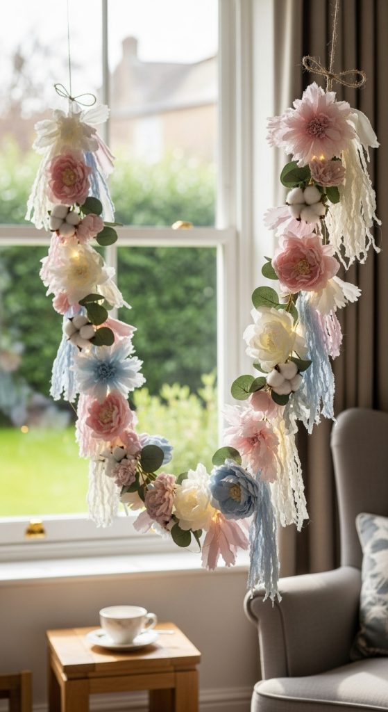 Garlands are a classic decorative element, and fabric flower garlands bring a charming handmade touch. You can use them for parties, seasonal decorating, or everyday home styling. Choose fabrics that suit the theme. For a soft romantic look, use chiffon, muslin, or lightweight cotton. For a cottage style aesthetic, try patterned floral fabric or linen.
