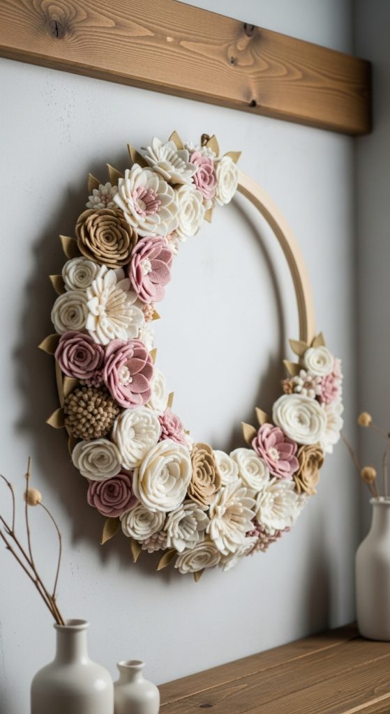 Add texture by mixing multiple fabrics such as felt for structure and chiffon for softness. You can also incorporate lace pieces, ribbon loops, or small fabric leaves. A partially covered wreath is perfect for a modern look, while a fully covered one feels lush and full. Hang the wreath on your front door, above your bed, or on a gallery wall for a welcoming touch.