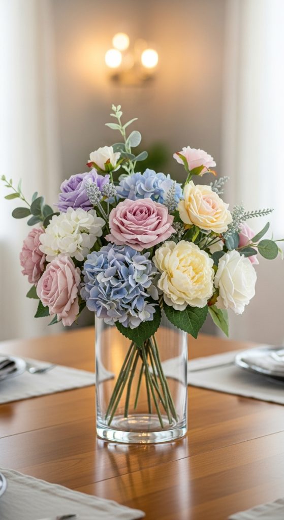 For a rustic look, use burlap fabric or linen in soft earthy tones. For an elegant design, choose chiffon or satin in pastel colors. If you want a bold statement, mix jewel tone fabrics like emerald, ruby, and deep blue. Add small filler pieces created from tulle or lace for extra volume. These centerpieces are also perfect for weddings and celebrations.