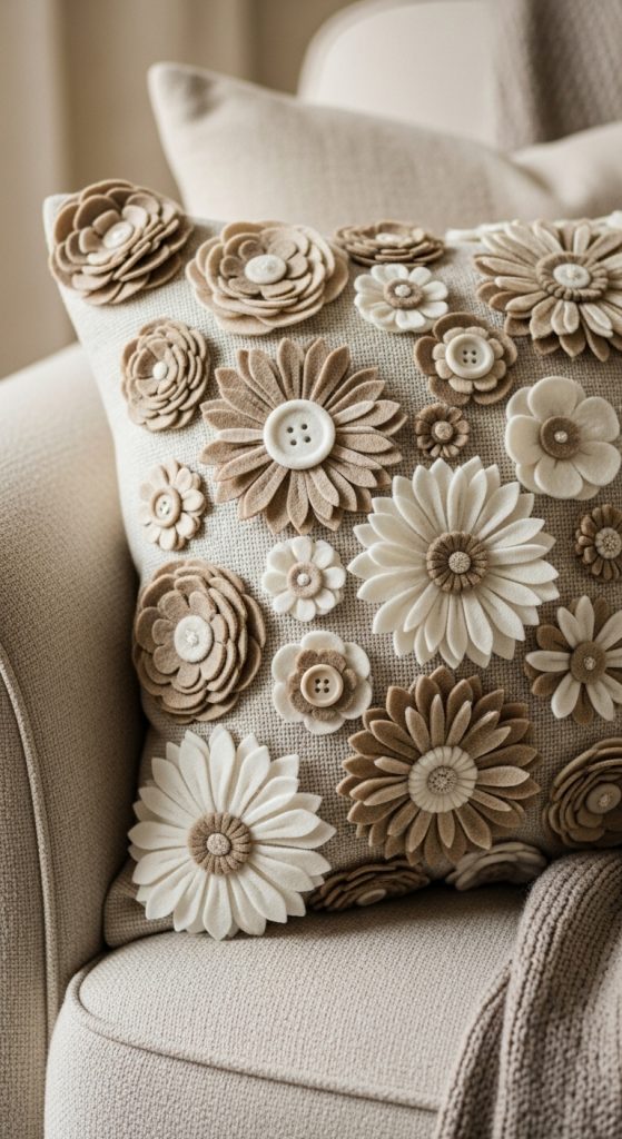 Decorative pillows with fabric flowers add charm to sofas, beds, and chairs. You can create a full floral pillow by covering the entire surface or sew a few flowers onto one corner for a subtle design. Felt and cotton fabrics work well for structured flowers, while chiffon or satin adds a delicate texture.