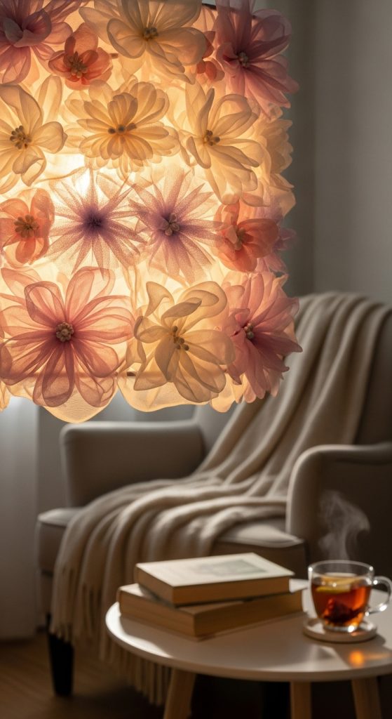 A full flower lampshade creates a dreamy soft glow, perfect for bedrooms or cozy reading corners. A minimalist approach, such as adding a single flower cluster on one side, works well for modern interiors. Make sure to keep flowers away from the direct heat of the bulb and use low heat LED bulbs for safety. This is an excellent way to upcycle an old lampshade.