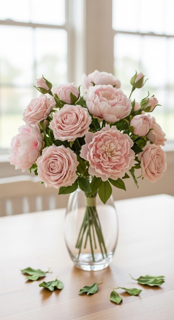 This project allows you to customize colors to match the room. Soft pastels suit feminine spaces, while deep tones bring richness to modern interiors. Add fabric leaves made from green felt or cotton, and wrap the stems with jute twine or satin ribbon. Place the bouquet in a vase or gift it as a handmade present.