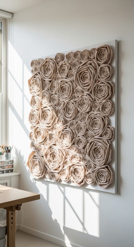 One easy approach is to create oversized fabric roses and arrange them in a cluster on a square canvas. You can also mix different flower types, such as peonies, daisies, and layered blossoms. Arrange them in patterns or create a full corner bloom for a half framed effect. Adding small leaves cut from green felt completes the composition. This type of wall art works especially well in bedrooms, craft studios, and gallery walls.