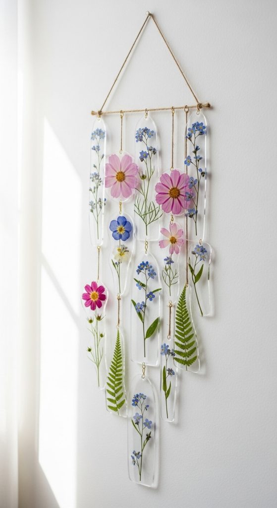 To create this look, press flowers between books or use a flower press tool. Once dried, seal them between clear acrylic sheets or inside small transparent frames. Attach each frame or acrylic tile to a hanging rod using twine or fishing line.