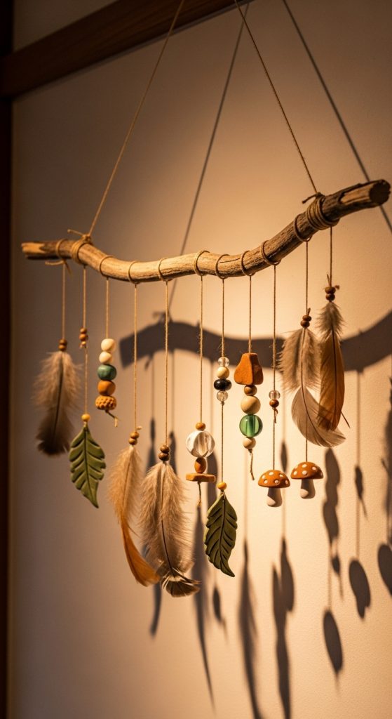 Attach charms such as feathers, beads, clay pieces, or small wooden ornaments. The mixture of natural materials creates a poetic combination of earthiness and simplicity.