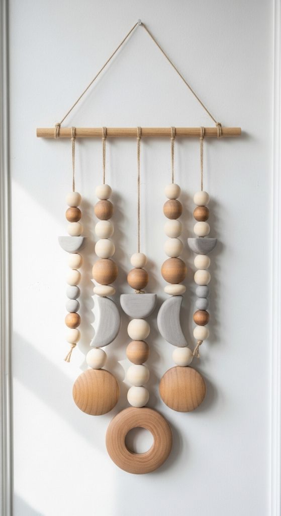 If you love subtle textures and natural tones, this wood and bead charm set is perfect. It combines smooth wooden beads, natural twine, and small wooden shapes like circles, half moons, or rods. The look remains simple while adding a soft visual rhythm to your wall.