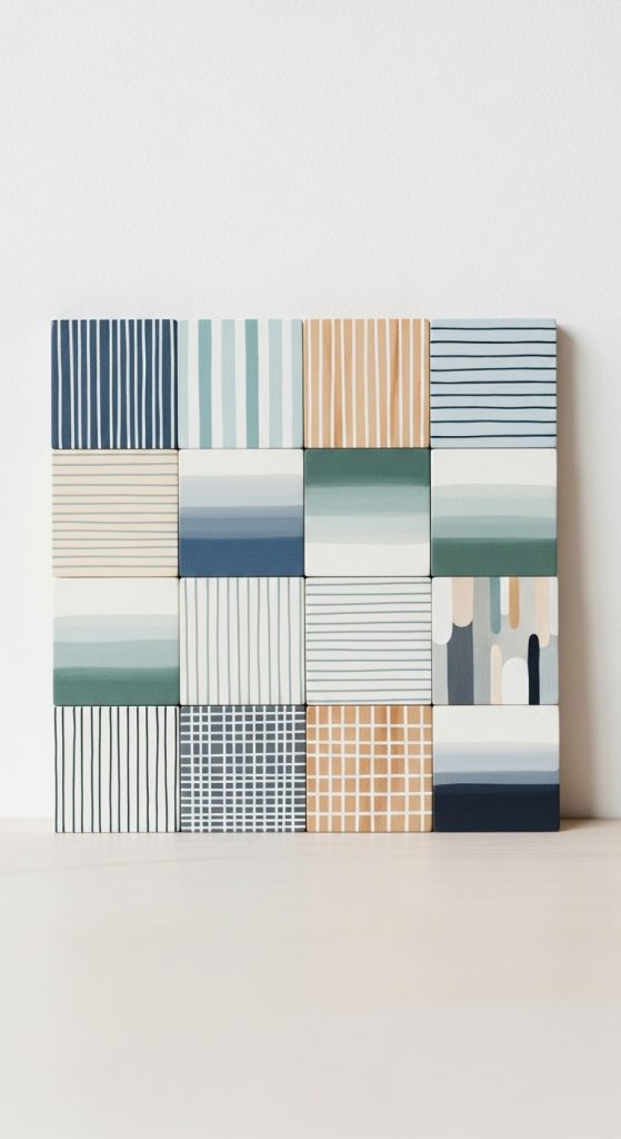 For those who love geometric patterns or abstract art, painted wooden tile charms are a great option. Cut small wooden squares or purchase ready made craft tiles and paint them with soft patterns like stripes, lines, waves, dots, or color blocks.
