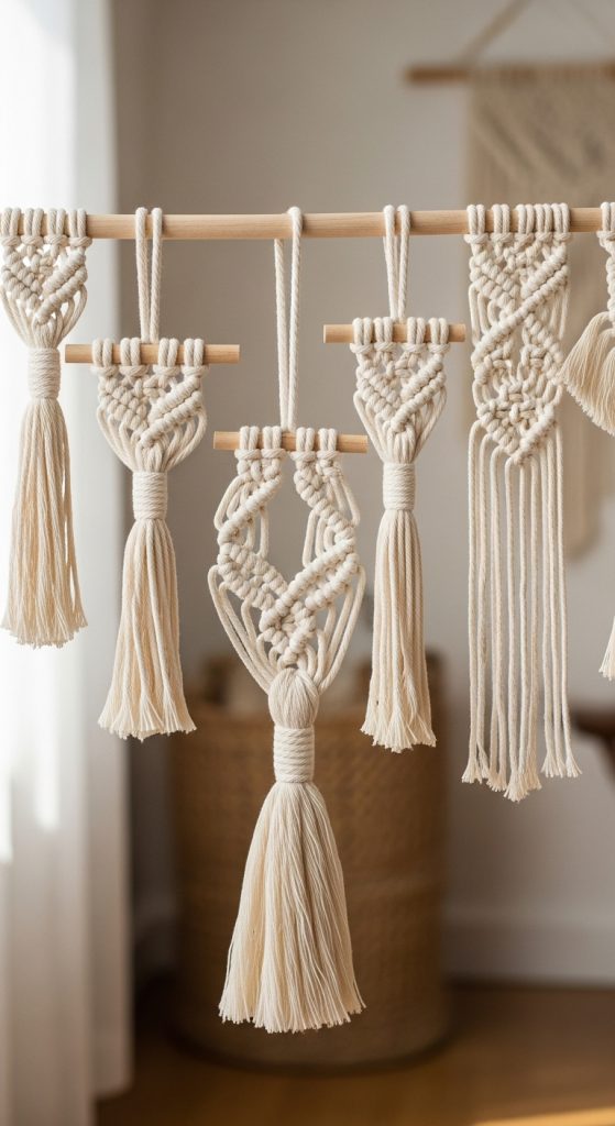 Instead of making one large macrame piece, you can design a series of mini charms arranged together on a wooden hanger or displayed individually in a cluster.