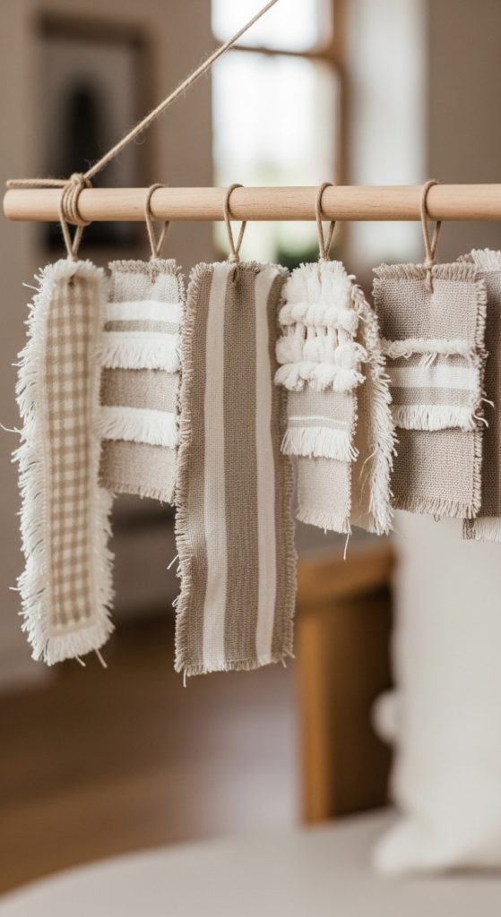 Layering fabrics or using frayed edges gives a handcrafted charm that feels naturally stylish without looking overly decorated. The simplicity of the materials allows you to create a cohesive, curated wall feature with minimal effort.