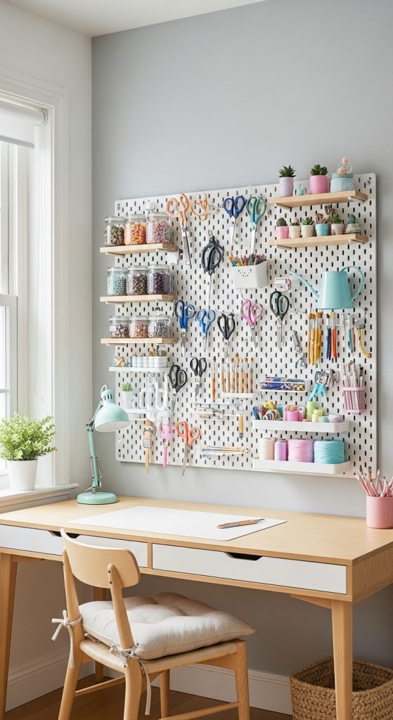 Pegboards are one of the most underrated DIY storage solutions. They are inexpensive, easy to mount, and customizable for all kinds of needs. A pegboard can hold craft supplies, tools, kitchen utensils, office accessories, or decorative pieces. It is especially popular in homes that blend functionality with creative aesthetics.