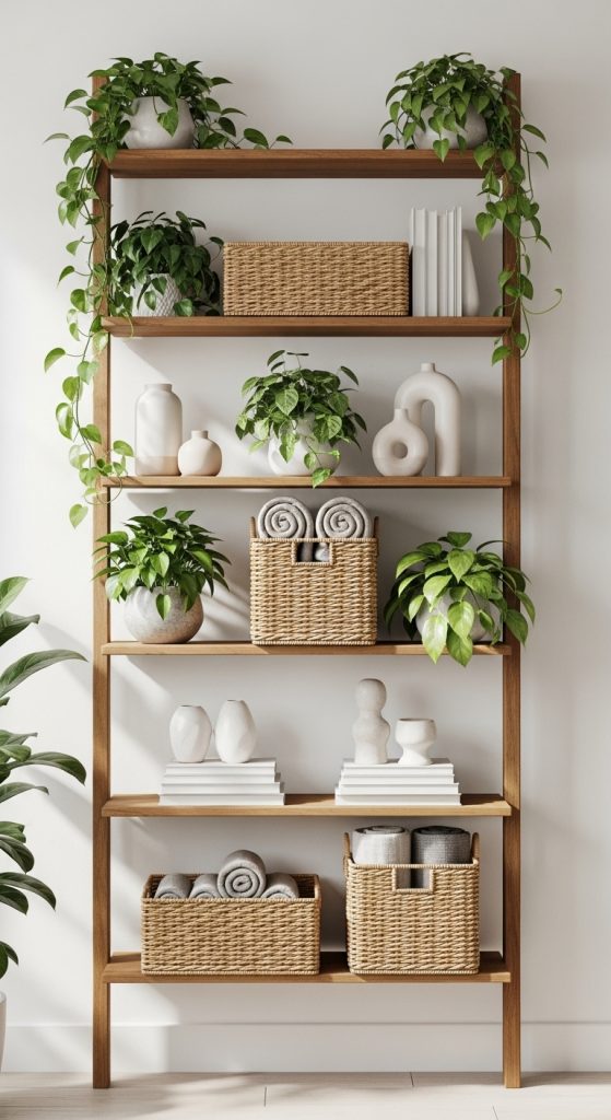 You can make the ladder from wooden boards and customize the number and spacing of the rungs. Each rung can hold shelves, baskets, or hooks depending on what you want to store.