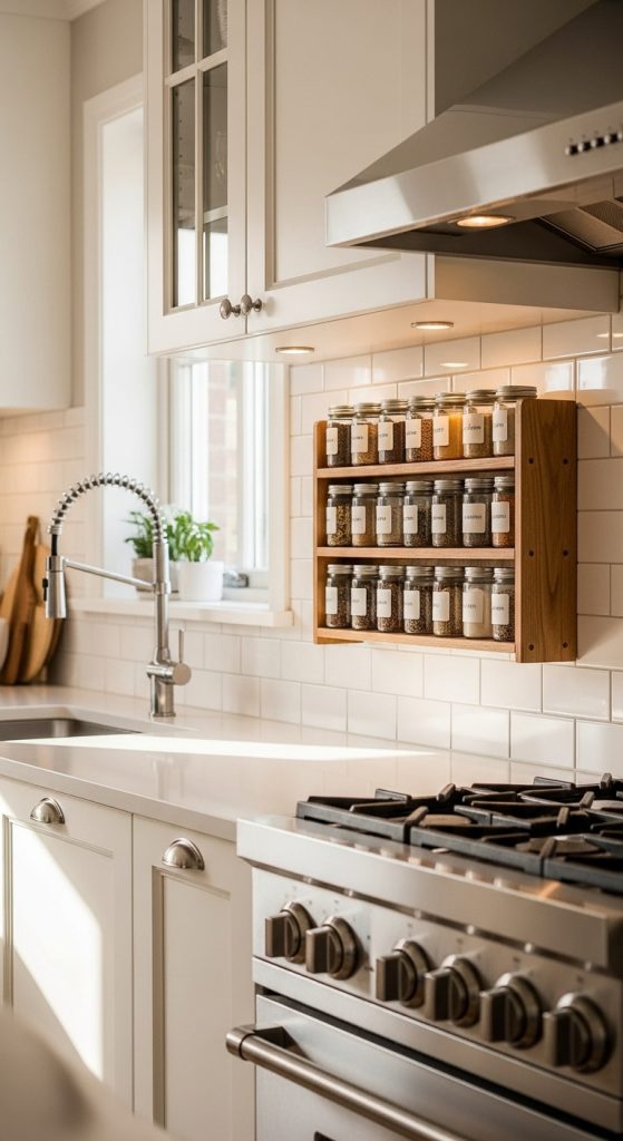 A common approach is to create narrow shelves that hold spice jars perfectly. You can add a small rail to keep the jars from falling off or use metal racks for a more industrial look. Mounting the spice rack near your cooking station makes cooking feel more efficient and enjoyable.