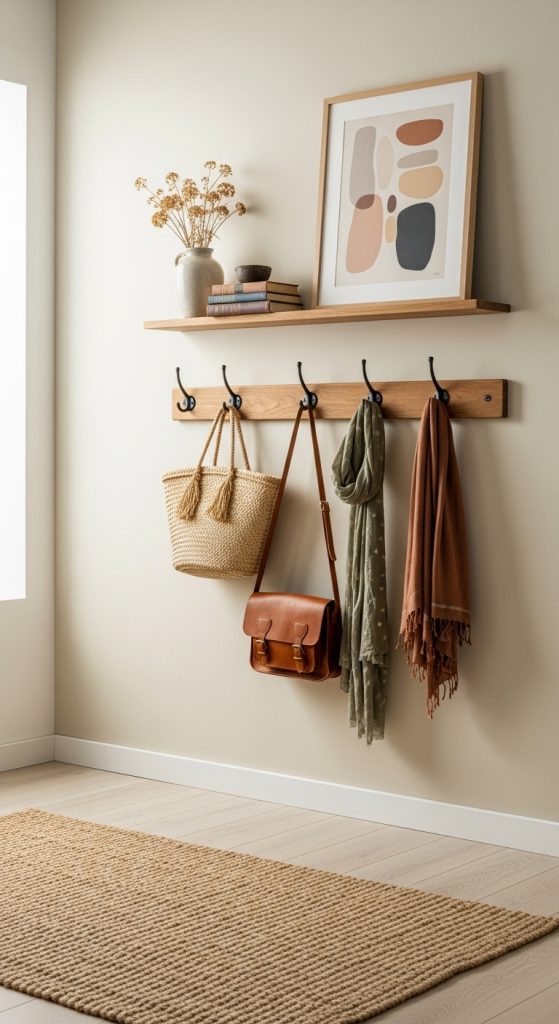 If you want a practical yet stylish organizer for your entryway, a wall mounted coat rack with a shelf is a perfect DIY solution. This combination allows you to hang coats, bags, hats, and umbrellas while also giving you a surface for decor or daily essentials.