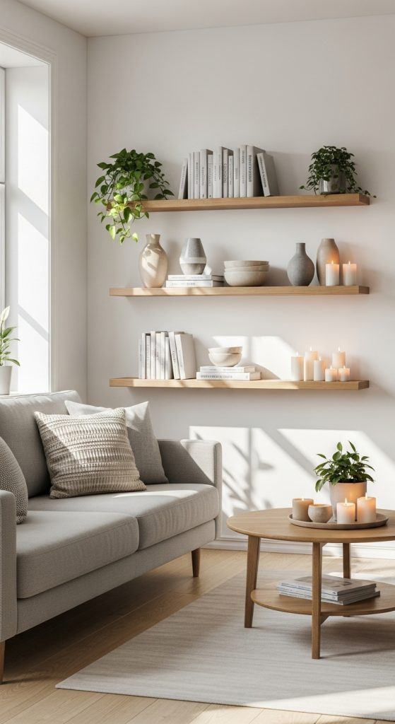 One of the best parts of floating shelves is how easy they are to style. You can mix decor with storage, incorporate candles and small baskets, or use them to break up a plain wall. By varying the lengths or arranging them in a tiered pattern, you can add even more visual interest. Floating shelves help transform blank walls into functional displays without overwhelming your space.