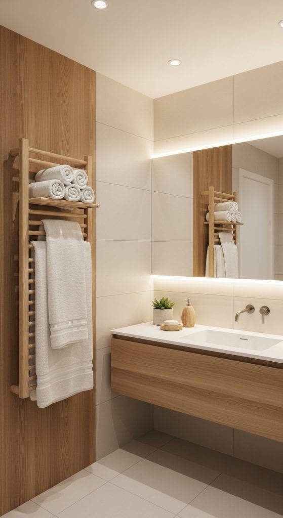 Bathrooms often lack storage space, especially in smaller homes. A wall mounted towel rack is an easy DIY project that instantly improves organization. You can create a simple wooden shelf with hooks underneath or build a ladder style rack that mounts directly to the wall.