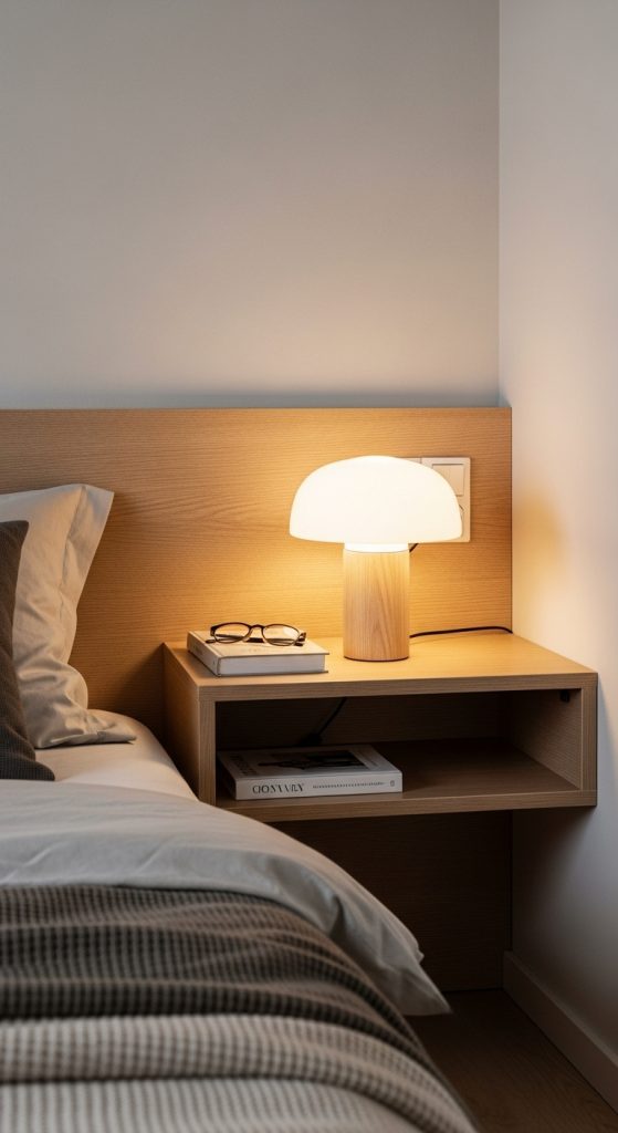 A simple wooden shelf works well for this idea. You can mount it at the height of your mattress and adjust the size to fit your needs. Some people prefer a deeper shelf with a hidden drawer, while others choose an ultra slim design for a modern aesthetic.