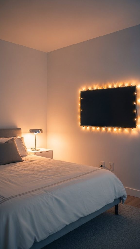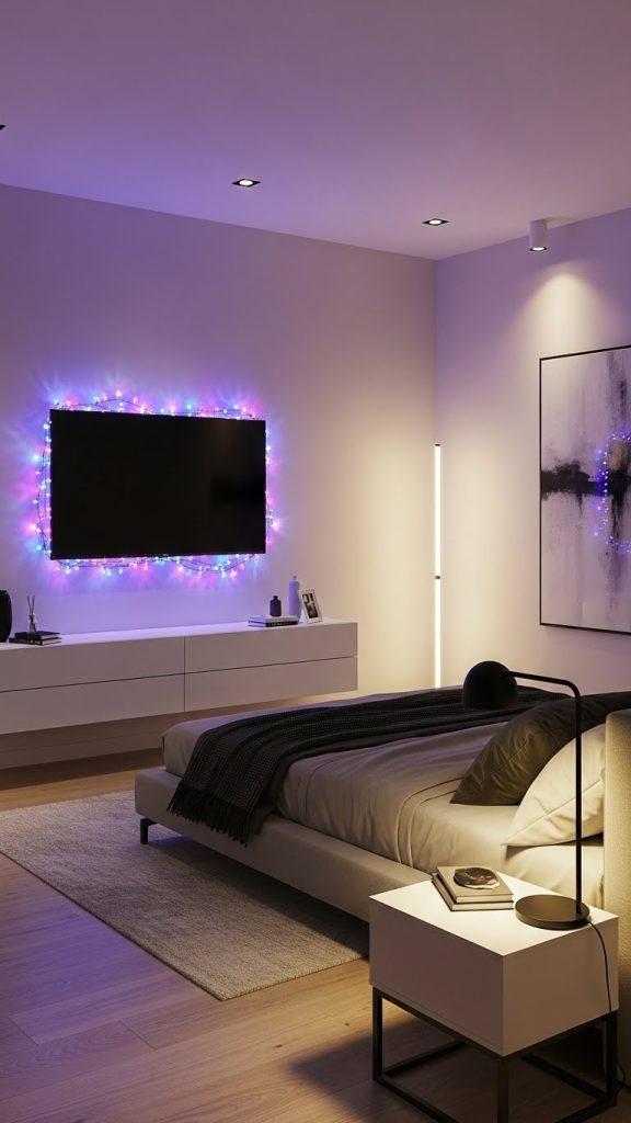 You can arrange the lights in a loose rectangular shape behind the TV or let them flow freely for a relaxed look. This idea is perfect for people who enjoy watching TV at night and want a peaceful atmosphere rather than harsh lighting.