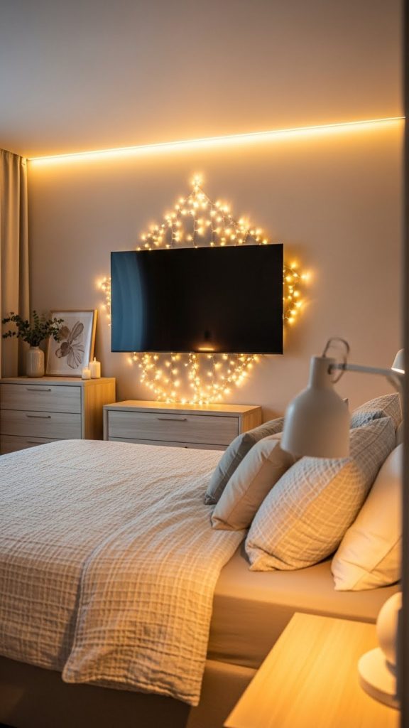 Star shaped fairy lights or tiny dot lights can create a starry night effect behind the TV. This idea is especially popular for young adults, teenagers, and anyone who loves a dreamy bedroom vibe.