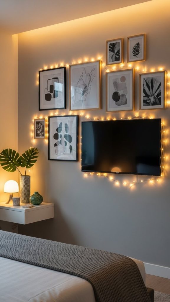 A photo wall combined with fairy lights behind the TV adds a personal and emotional touch to your bedroom. You can hang photos using clips or string lines and weave fairy lights through them.