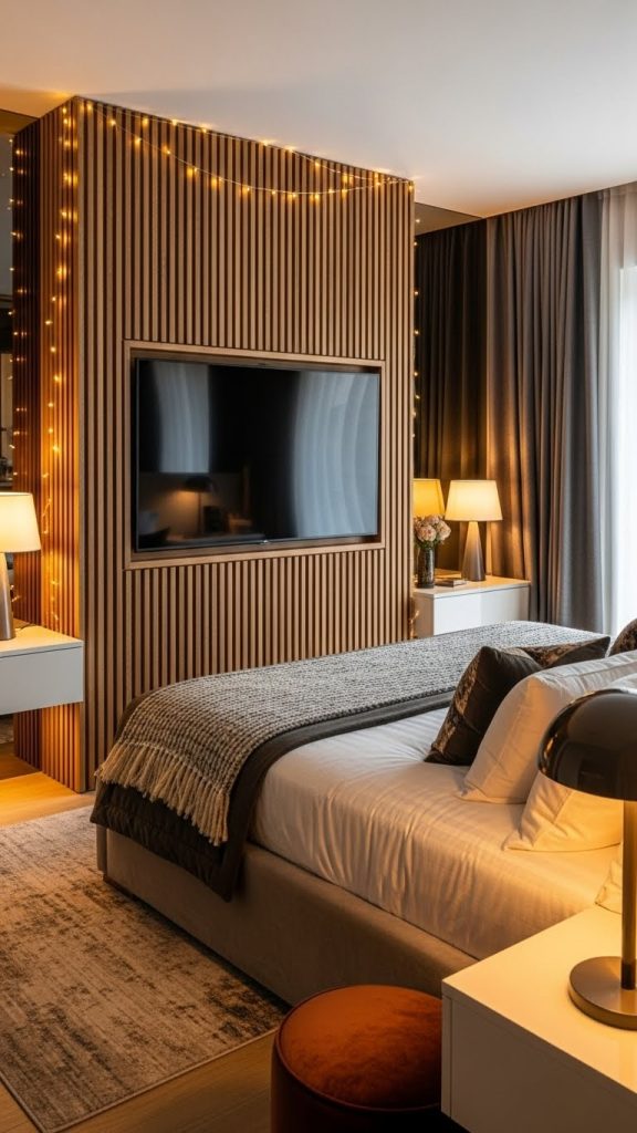 This idea is perfect for bedrooms with modern or luxury interiors. The combination of wood texture and soft lighting creates warmth and depth. It also makes the TV wall a focal point of the room.