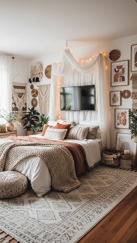 This idea turns the TV wall into a complete decor statement rather than just a functional area. It works well in creative bedrooms and Pinterest inspired spaces.