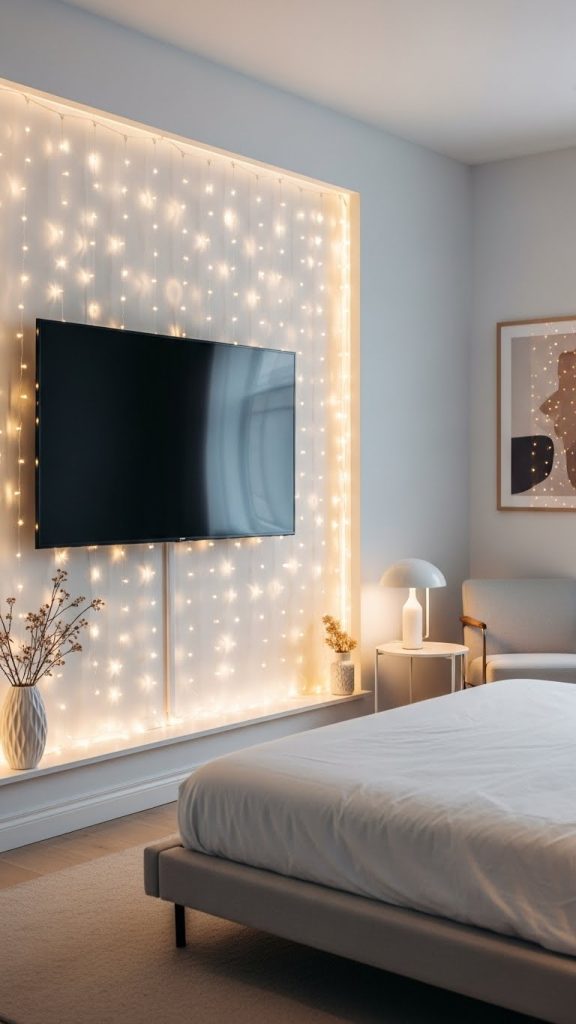 This idea works best when the TV is mounted on the wall. The curtain lights can cover a wider area behind the TV, making the wall look taller and more elegant. This setup looks especially beautiful in larger bedrooms where the TV wall needs visual balance.