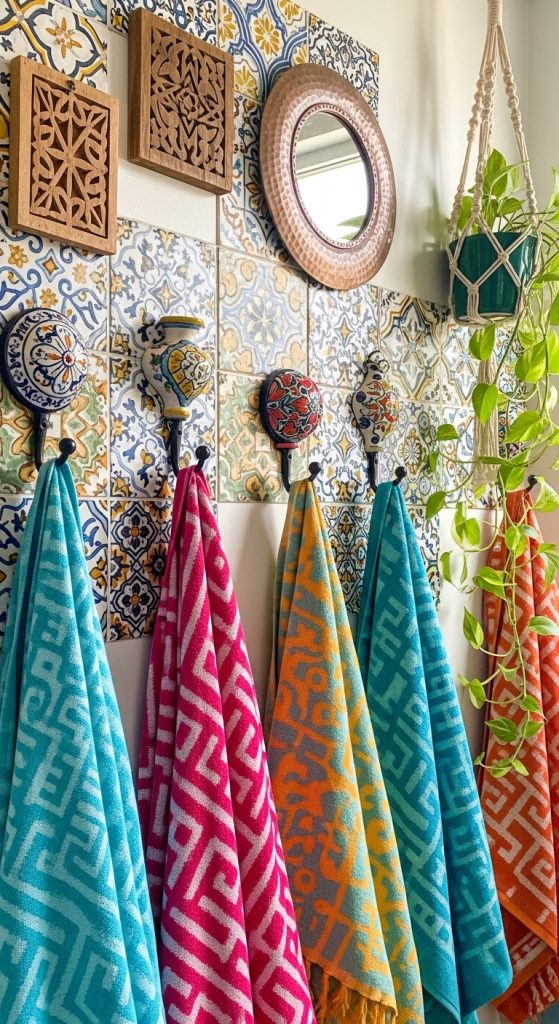 If you want your bathroom to feel bright, lively, and artistic, colorful ceramic hooks are the way to go. They come in endless hues, patterns, and designs—from Moroccan mosaics to floral motifs. These hooks instantly elevate a plain wall and act as mini art pieces.