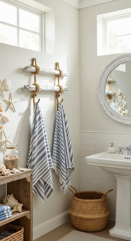 You can mount rope hooks on driftwood or whitewashed wood boards to complete the look. Adding small seashells, anchors, or ship wheel details enhances the nautical feel even more. This design is perfect for a summer home, coastal bathroom, or kid-friendly beach house.