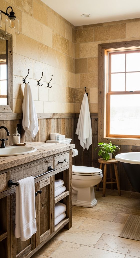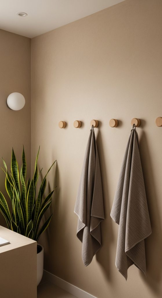 Design tip: Use matte black or brushed bronze hooks for a classic rustic finish. If you have a smaller bathroom, mount a single long wooden panel with multiple hooks to save space.