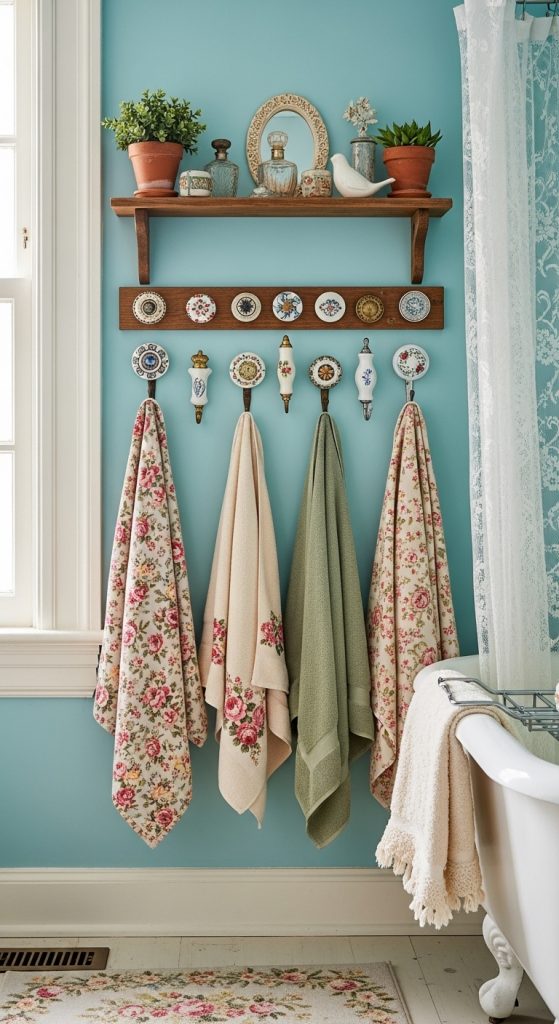 Each knob can be different, creating an eclectic and whimsical vibe. You might mix porcelain knobs, glass handles, or ornate brass pieces for a curated, collected look. These hooks work especially well in shabby chic, bohemian, or cottage-style bathrooms.