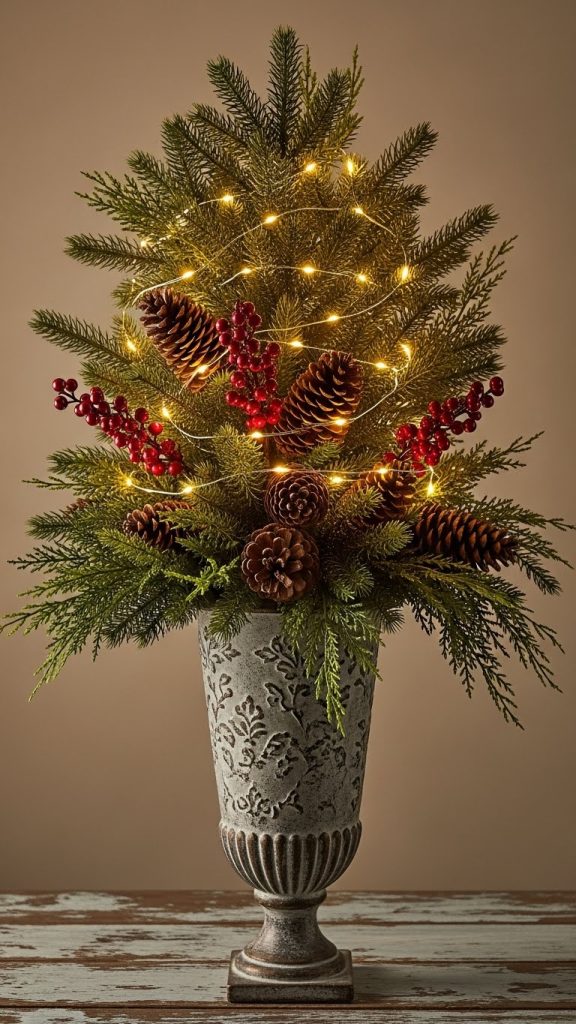 An evergreen branch lamp brings the fragrance, texture, and natural beauty of winter greenery into your home. To create this look, wrap LED string lights around a bundle of fresh or faux evergreen branches. Arrange the branches in a tall decorative vase, ensuring the lights are evenly distributed throughout the arrangement.