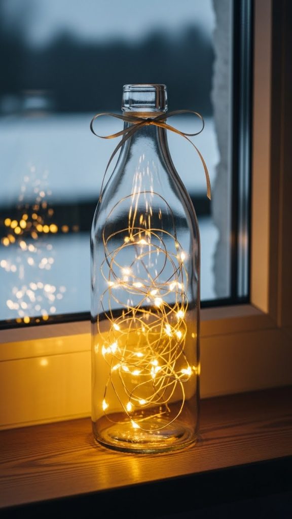 A twinkle light bottle lamp is simple, stylish, and incredibly easy to make. Start by choosing a decorative glass bottle in any shape or color. Remove any labels and clean the bottle thoroughly. Insert a string of LED fairy lights inside, arranging them so they fill the bottle evenly. Once lit, the bottle glows beautifully and adds a warm twinkling effect to your holiday decor.