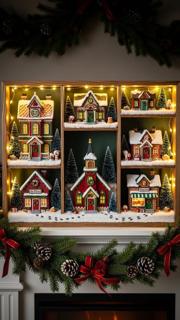A holiday village lamp box is a creative way to combine illumination with nostalgic holiday scenes. Start with a wooden or metal shadow box, then fill the inside with miniature holiday buildings, trees, figurines, and tiny decorative accents. Add LED strip lights or fairy lights around the interior edges to illuminate the entire display.