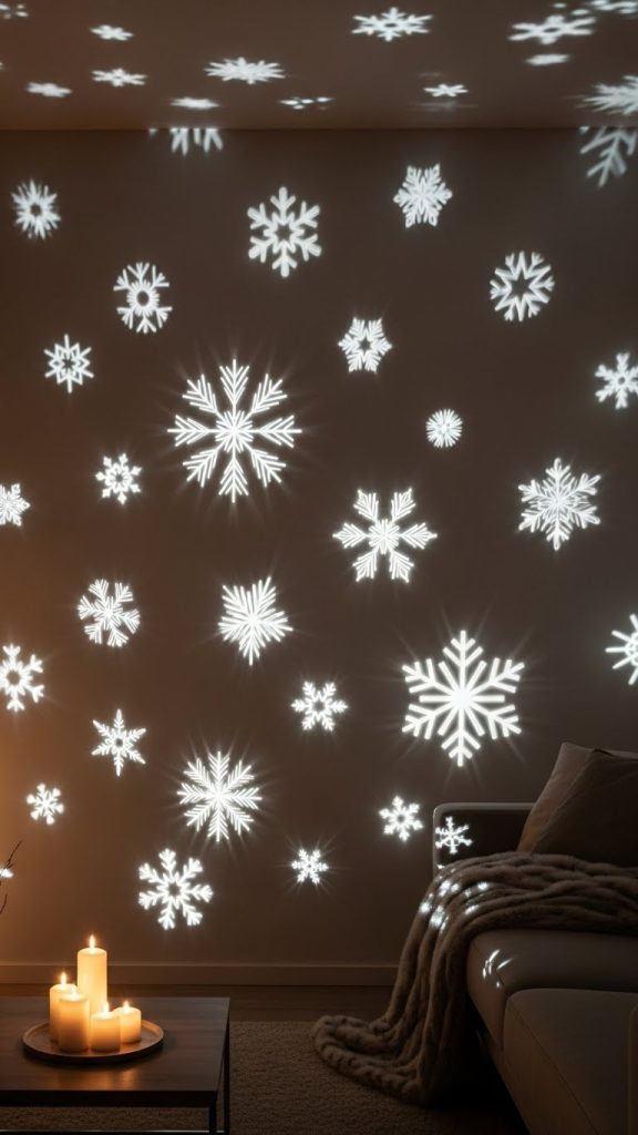 A snowflake projection lamp adds a unique and captivating element to your holiday lighting. When turned on, this lamp projects snowflake patterns onto nearby walls or ceilings, filling your room with dancing winter shapes. You can use a store bought projection lamp or create your own with cut out snowflake stencils and a directional LED light.