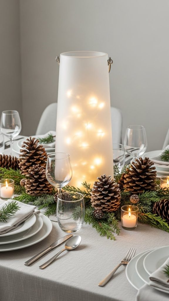 The beauty of this lamp idea is its versatility. You can use warm white lights for a classic holiday feel or choose cooler white lights for a snowy, winter inspired look. For added charm, place pinecones, small ornaments, or greenery at the base of the lantern. This glowing lamp is perfect for dining tables, bedside tables, or as an accent in a cozy reading corner.