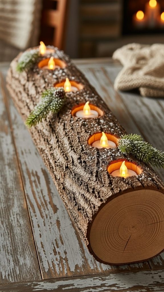 For a natural and cozy holiday aesthetic, a rustic log candle lamp brings warmth and organic beauty into your home. Start by selecting a piece of wood or a small tree log with a flat base. Drill circular holes across the top of the log to fit tea light candles or battery operated LED candles. Once the candles are placed inside the carved slots, the log transforms into a glowing, nature inspired lamp.